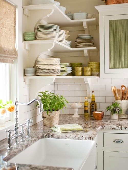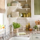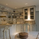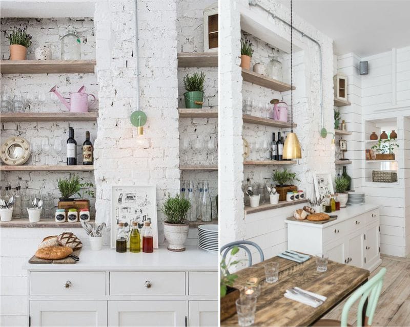 Dans la cuisine, faites dans une exquise étagère de style rustique semble tout à fait approprié. Dans le style provençal, les étagères ouvertes étaient présentes à l'origine, avec des assiettes et des fleurs dans de petits pots.
