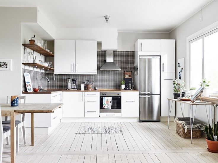 Dans le style scandinave, le plus souvent utilisé des matériaux naturels - bois, métal, pierre. Par conséquent, il est préférable que les étagères de la cuisine de ce style soient en bois ou en métal. Très efficacement dans le cadre de ce style se penchera sur une combinaison d'étagères fermées et ouvertes.