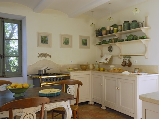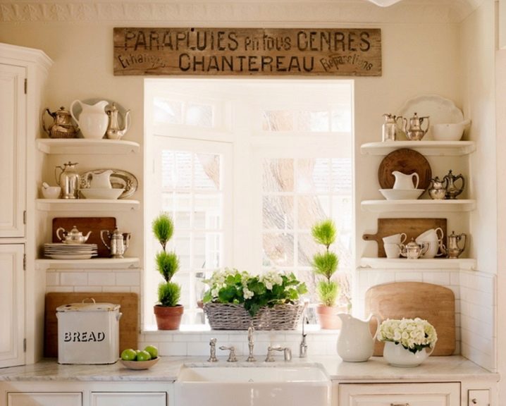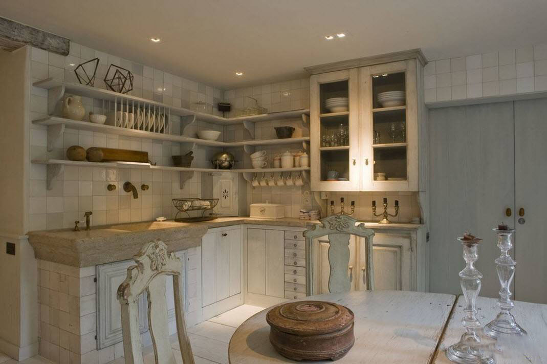 Aujourd'hui, les cuisines de style provençal sont très populaires dans de nombreux pays. Pour compléter cet intérieur, on utilise le plus souvent des étagères stylées en bois naturel.Le plus souvent, le matériau utilisé pour créer les étagères est vieilli artificiellement. En ce qui concerne les couleurs, dans le style provençal, les plus appropriées seront des étagères soignées en bois clair de couleurs beige, grise et même blanche.