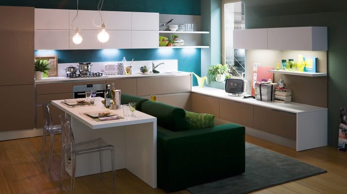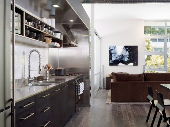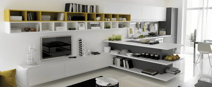 Lors de l'installation d'étagères ouvertes, rappelez-vous qu'elles attireront beaucoup d'attention. Cela est particulièrement vrai pour les cuisines connectées au salon. Dans ce cas, les étagères peuvent être placées à la jonction des deux zones. Ainsi, ils seront simultanément perçus comme un détail fonctionnel et comme une décoration d'espace.