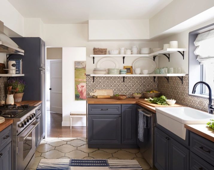 Dans les cuisines modernes, les étagères d'angle sont également souvent utilisées. Ils complètent bien l’intérieur, comme une petite cuisine et une grande pièce. Les étagères d'angle permettent d'économiser de l'espace. En même temps, vous pouvez utiliser différentes idées de design pour donner à une simple option de tablette une allure élégante et inhabituelle dans l’espace de la cuisine.