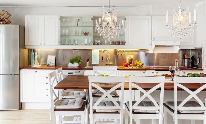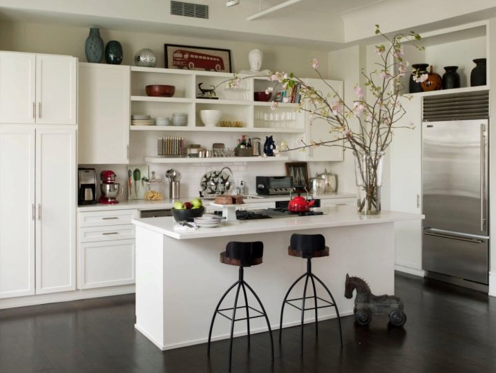 De nombreux experts estiment que les étagères ouvertes sont beaucoup plus appropriées à l'intérieur d'une cuisine moderne que les armoires fermées classiques. Un tel détail fonctionnel a l'air intéressant et frais et vous permet d'ajouter une touche d'élégance à l'intérieur grâce à l'utilisation de divers petits détails - bougies, bocaux, assiettes et diverses boîtes. Très souvent, cette solution de conception est utilisée dans les cuisines américaines et européennes.