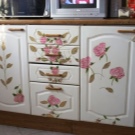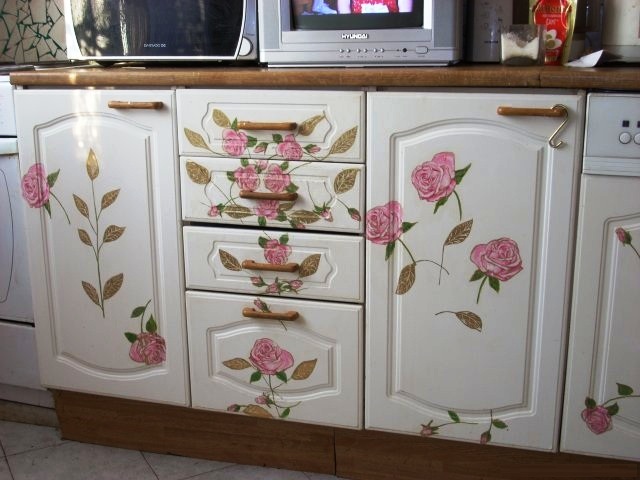 Pour économiser, vous pouvez améliorer l'ancien ensemble de cuisine, créer un design arrondi du plateau et ouvrir les étagères, le peindre avec des peintures à base d'eau ou créer un revêtement stratifié, puis le coller avec un film spécial avec de belles textures ligneuses.
