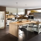 Les meubles de cuisine les plus chers, mais de haute qualité, sont en pin, chêne, frêne, hêtre, bouleau, merisier et autres massifs en bois aux propriétés utiles. Différentes variétés ont leurs avantages. Par exemple, le chêne et le frêne sont très durables, avec de belles textures, le bouleau est malléable dans le traitement et vous permet de créer n'importe quelle forme, et les cerises ou les conifères ont un arôme léger et agréable. Les armoires de cuisine en bois sont respectueuses de l'environnement et leur apparence fera forte impression sur les invités.