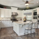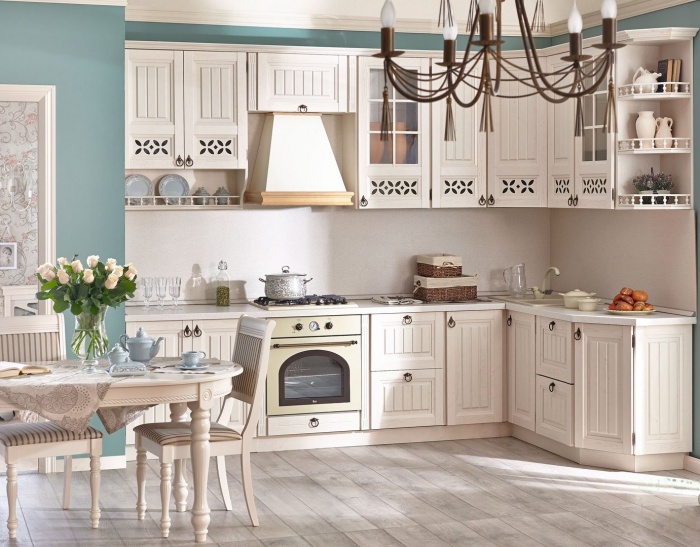 Les images élégantes dans la cuisine spacieuse forment le casque dans le style de "Provence", remplissant tout l'espace utile. Tous les meubles ont une couleur blanche agréable avec une torsion beige et un décor magnifique. La position angulaire offre liberté et confort au travail.