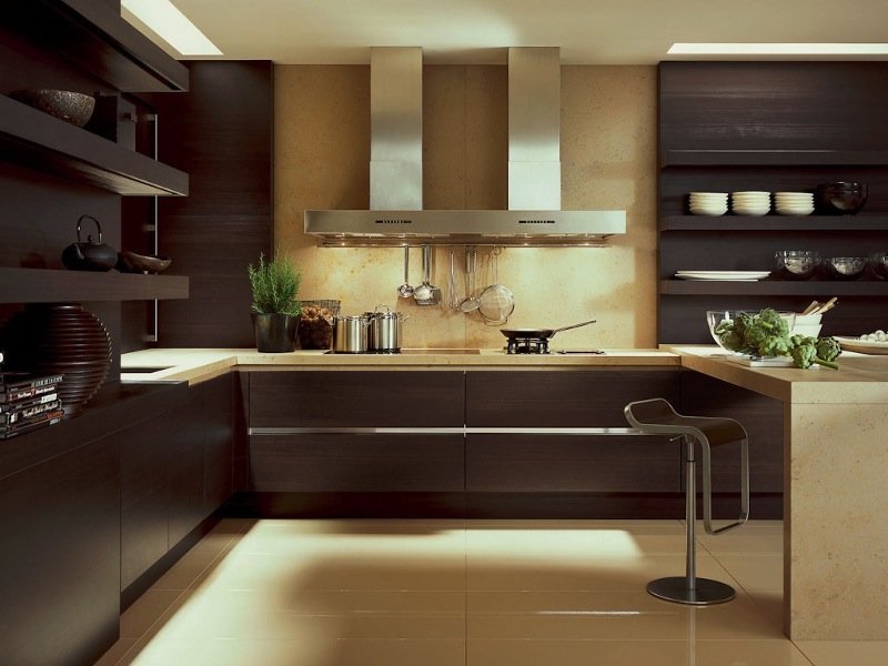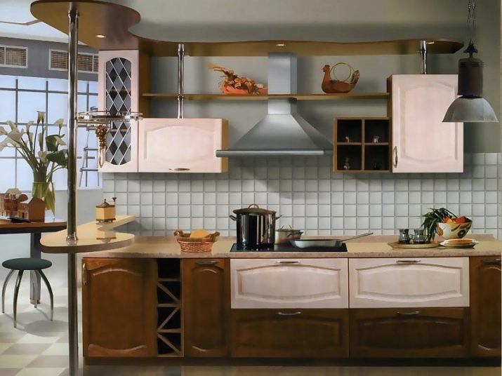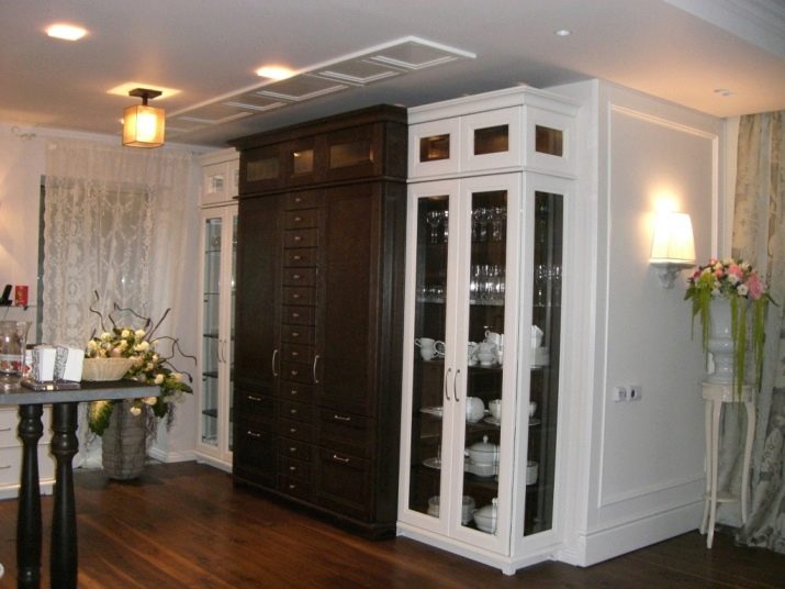 Les armoires confortables avec un accès facile à la vaisselle doivent se trouver dans le micro-casque de toute cuisine. Les méthodes de conception modernes vous permettent de créer des meubles compacts et spacieux.contenant des compartiments pour petits appareils: hachoirs à viande, moulins à café, mélangeurs, spéciaux pour casseroles et poêles, étagère suspendue en acier inoxydable pour ranger les assiettes, boucles pour suspendre les écumoires et les louches.