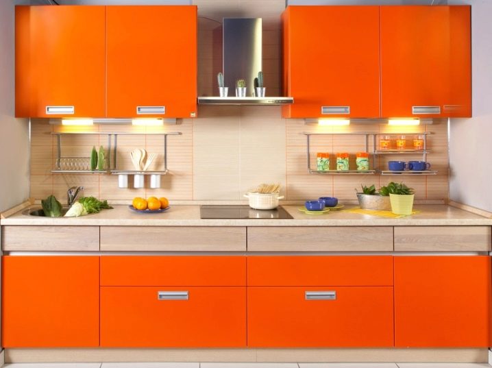 Un coin cuisine avec des modules orange et un éclairage de table supplémentaire vous permet d'organiser un espace de travail de manière élégante et efficace. Des idées similaires pour les meubles de cuisine conviennent particulièrement aux jeunes familles. Dans le kit oreillette, vous pouvez adapter harmonieusement vos appareils ménagers et votre télévision.