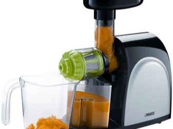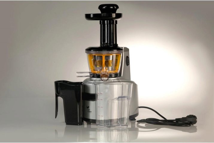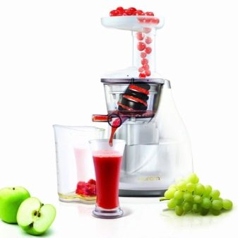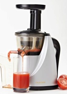 Le deuxième type de presse-agrumes est la tarière, qui permet d'obtenir du jus en pressant le produit. Les machines à vis ont moins de puissance et presque pas de bruit. Ils peuvent même survivre au jus des baies avec des os, ce que ne peuvent faire les agrégats centrifuges. Un autre avantage de ces modèles est le faible contact du jus avec l'air lors de son extraction. De plus, il ne chauffe pas le jus, ce qui vous permet de conserver les propriétés utiles du produit.