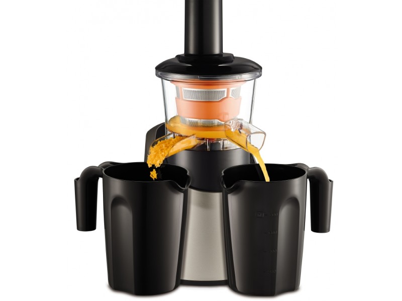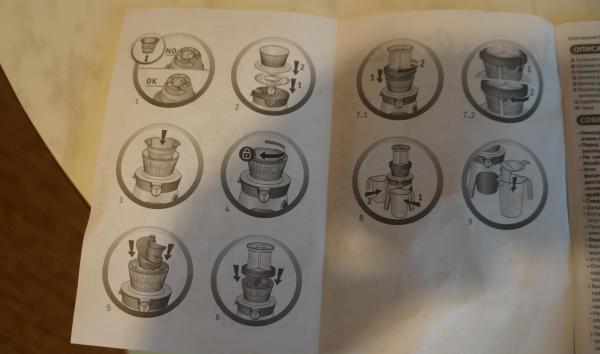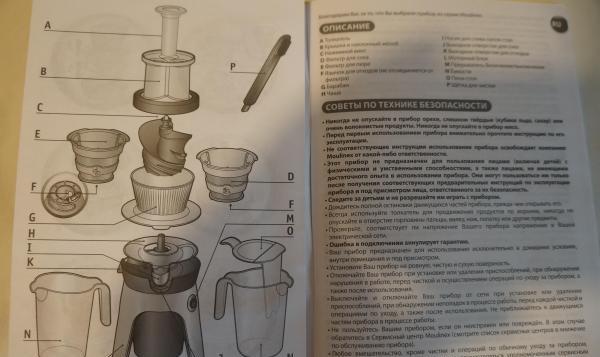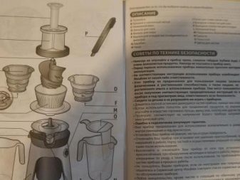 Les agrumes devront être coupés en tranches pour passer dans l'ouverture de chargement. La partie principale des pièces est en plastique, les éléments de l'appareil en métal ne sont pratiquement pas en contact avec les aliments. La principale caractéristique est le manque de chauffage du produit final, cela vous permet de conserver toutes les précieuses vitamines des matières premières. Le kit comprend un séparateur de mousse.