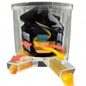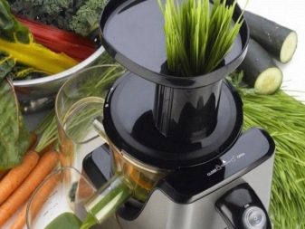 - Arrangement horizontal de la vis. Le mécanisme est équipé d'un rouleau spécial semblable à un hachoir à viande, mais il manque le couteau et le gril. À leur place se trouve une valve réglable, libérant le gâteau. Un tel appareil peut traiter les herbes et les légumes verts, en leur enlevant des smoothies diététiques et très sains. Cette tâche est mieux gérée par des périphériques de ce type uniquement.