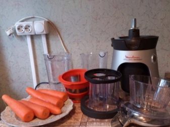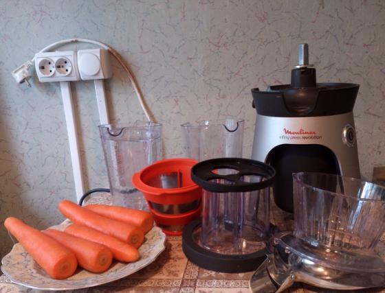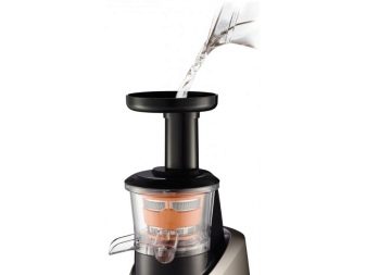 Le bruit du moteur ne dépasse pas 70 dB, le moteur asynchrone a une puissance de 300 W, il est capable de faire sortir le jus même des herbes, comme le persil, le céleri ou la coriandre. Avant de traiter des baies avec un gros os, le noyau des baies doit être enlevé.