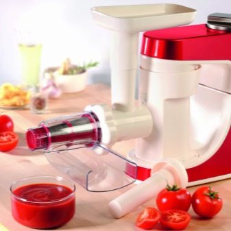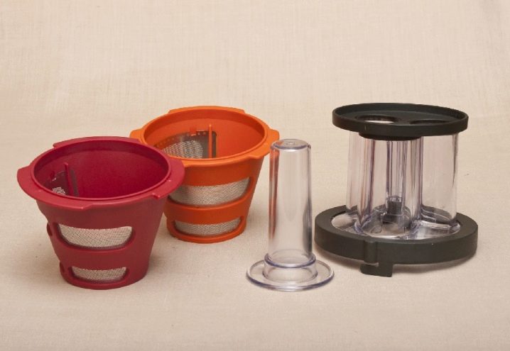Dans le set, il y a une paire de buses: jaune avec de petites ouvertures - pour le jus; rouge - pour purée de pommes de terre. Le dernier essorage à travers ces buses contiendra de la pâte, avec une différence de quantité. De plus, cet indicateur sera affecté par la variété du fruit en cours de traitement.