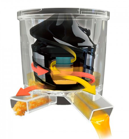 L'appareil utilise le principe de la haute pression, qui, combiné à un système à vis, produit un spin de trente pour cent plus efficacement que dans les analogues d'une centrifugeuse. Il permet d'économiser jusqu'à 75% d'antioxydants et de vitamines en plus.