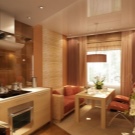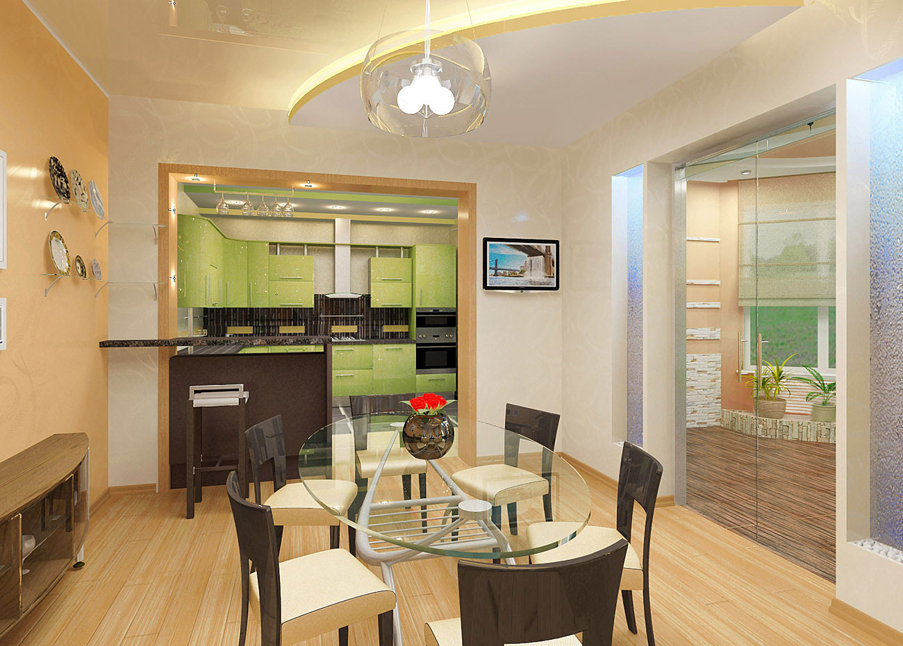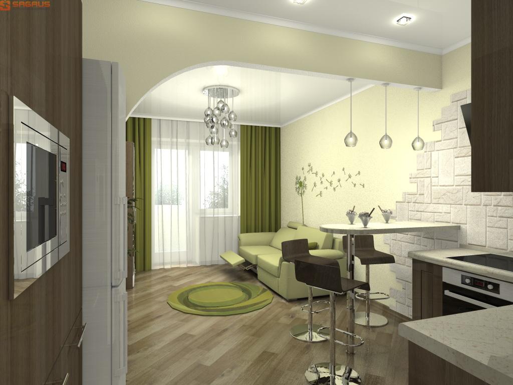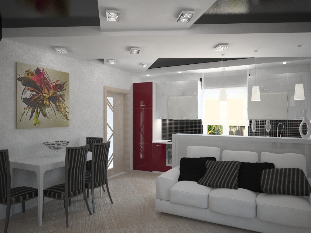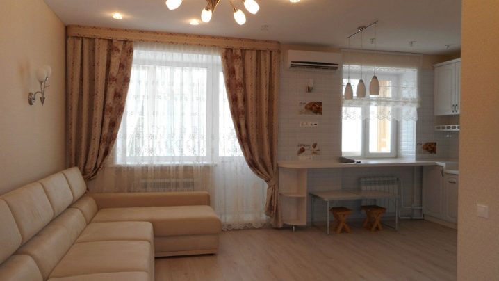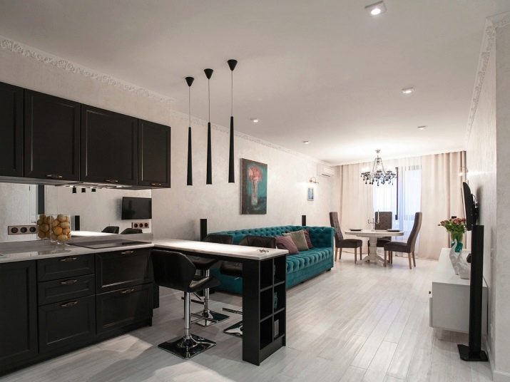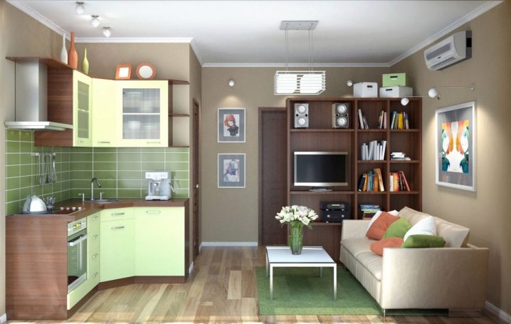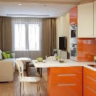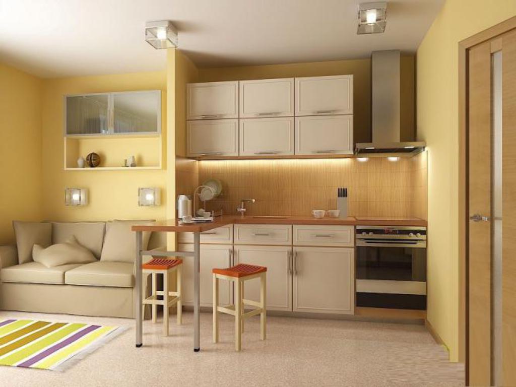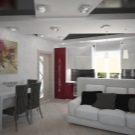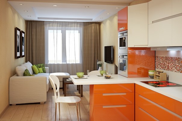 L'effacement visuel des bordures permet de fermer ou la même palette de couleurs du sol, du plafond, des murs, de la présence des mêmes accents de couleurs dans la cuisine et dans le salon, solution unicolore de la pièce entière. L'option la plus économique pour combiner des zones peut être le mur habituel joliment décoré.Parfois, les solutions simples pour les petites pièces sont les meilleures.