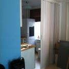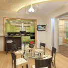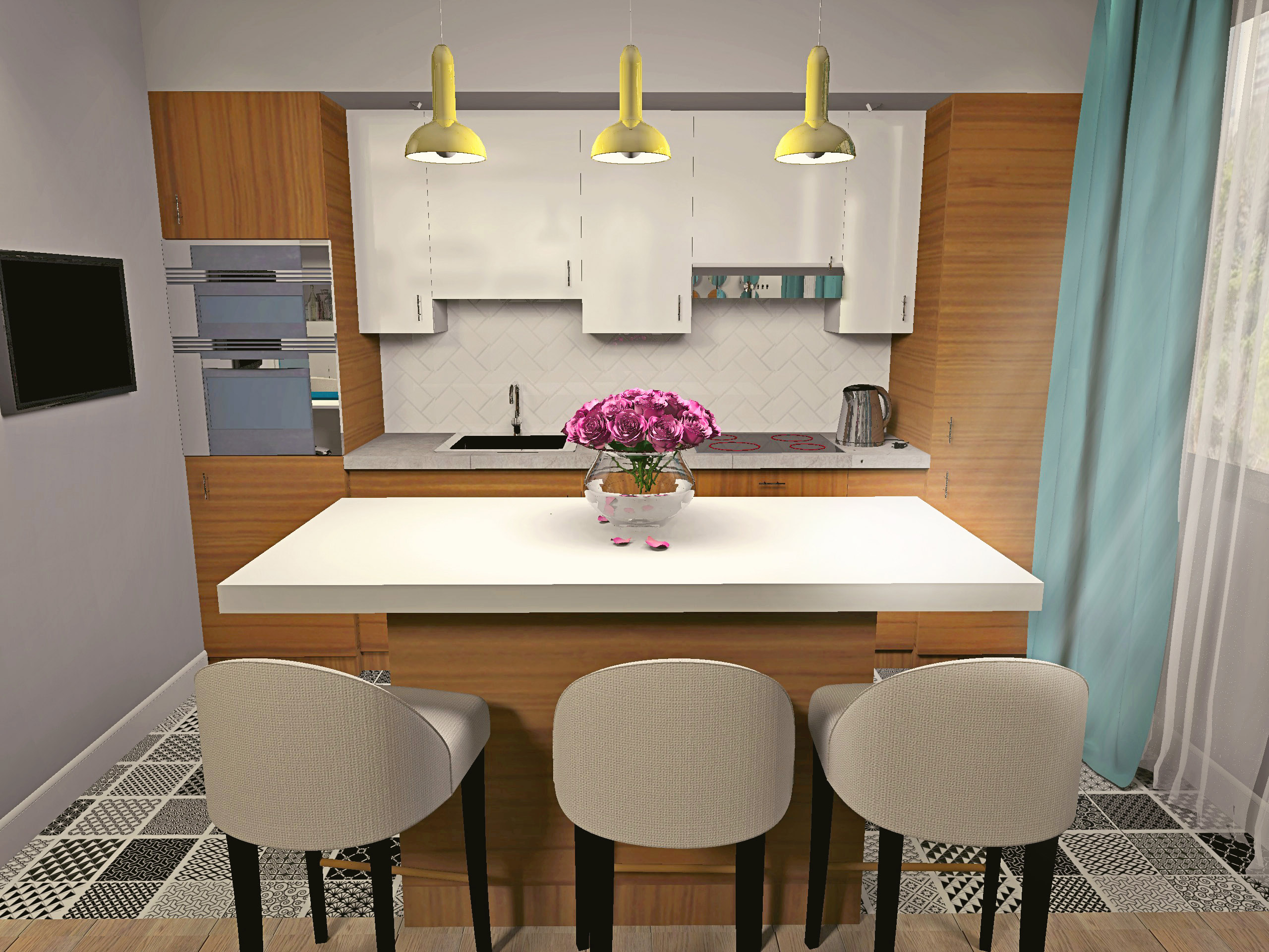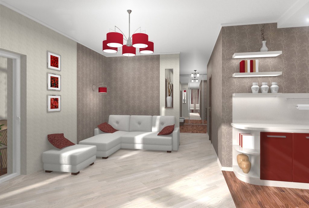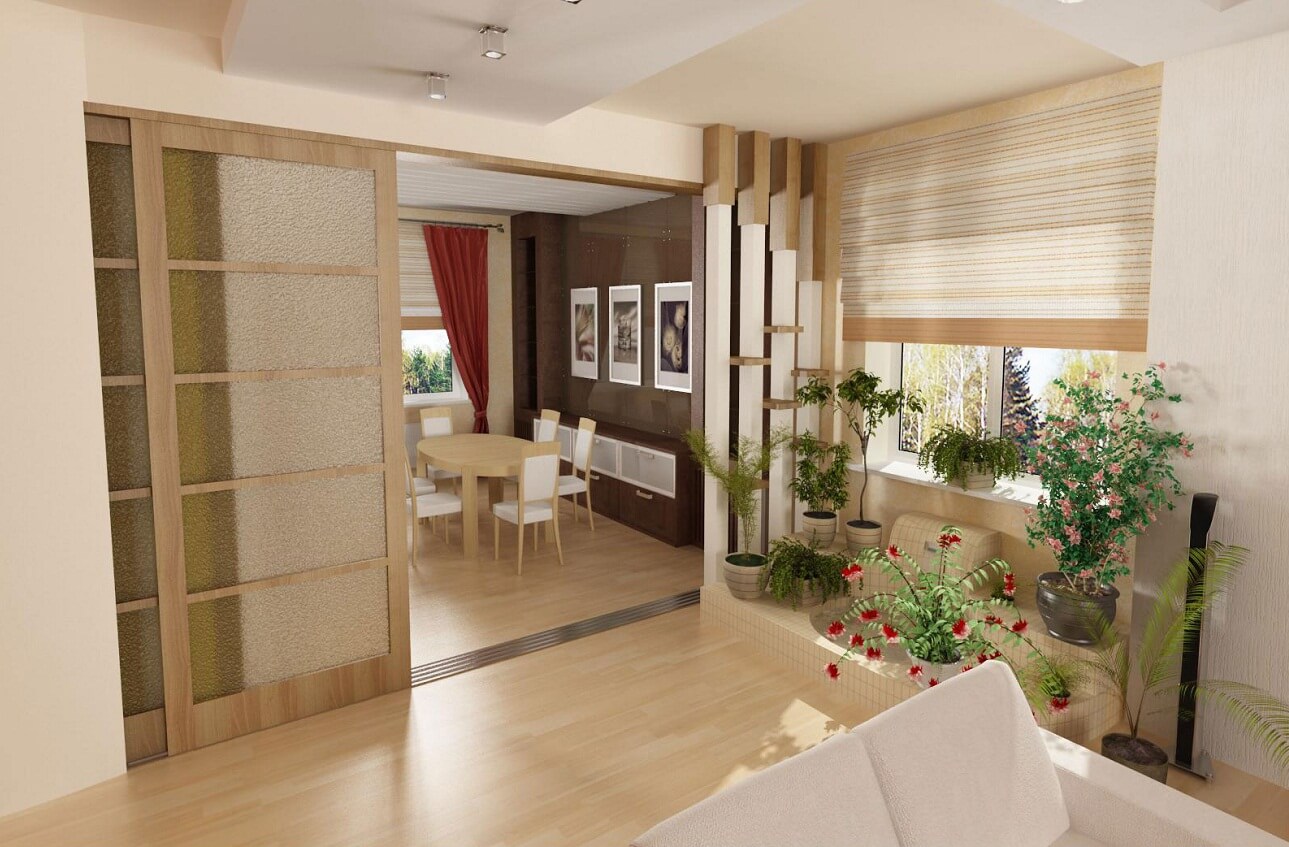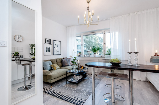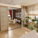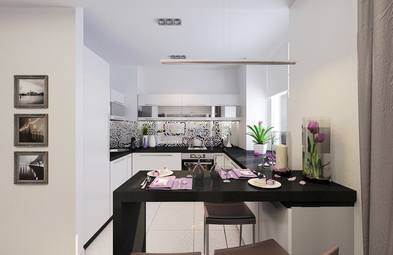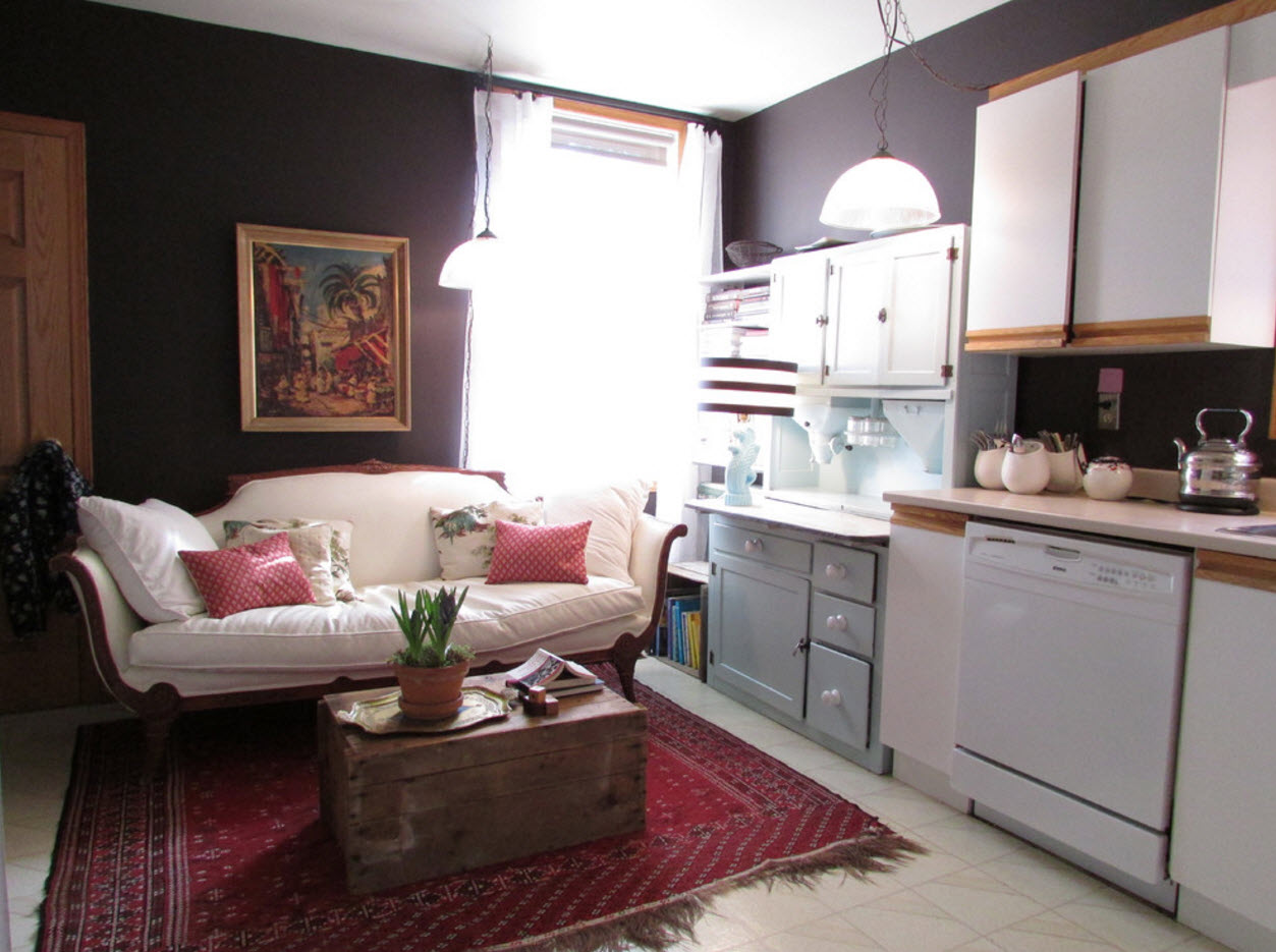 L'effacement visuel des bordures permet de fermer ou la même palette de couleurs du sol, du plafond, des murs, de la présence des mêmes accents de couleurs dans la cuisine et dans le salon, solution unicolore de la pièce entière. L'option la plus économique pour combiner des zones peut être le mur habituel joliment décoré.Parfois, les solutions simples pour les petites pièces sont les meilleures.