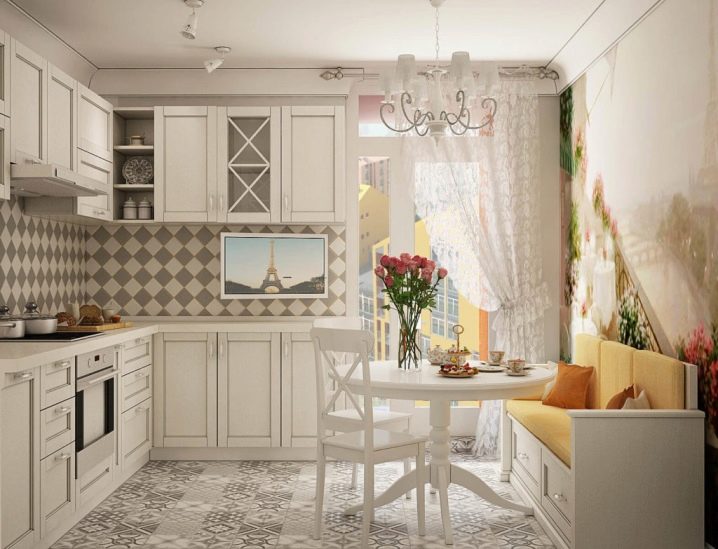 Pour les espaces ouverts, les solutions de cuisine classiques restent pertinentes: ligne simple, double rangée, angle, en forme de U et «îlot». Le coin est le plus facile à adapter à n’importe quelle configuration de la pièce, le U et l’îlot sont pratiques pour combiner des zones. Le désir de garder le plus d’air possible dans la pièce nous obligera à rechercher des moyens d’alléger le sol de la cuisine.Les meubles de petites dimensions et de faible profondeur, l’utilisation de façades brillantes et transparentes, le remplacement du boîtier supérieur par des étagères ouvertes, y compris celles en verre, faciliteront la tâche.