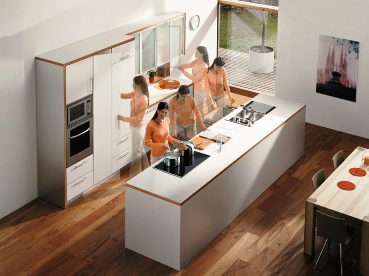 Admission autorisée. La logistique cuisine-salon a des solutions traditionnelles, mais dans les familles modernes, les places de stationnement et de transit peuvent différer considérablement de ces systèmes. Par exemple, le contenu classique du «triangle de travail» - réfrigérateur, cuisinière, évier - peut être remplacé par un réfrigérateur, un four micro-ondes, un évier. Dans ce cas, le poêle ne fera plus partie de la composition centrale et plus d’espace ira à l’endroit où la vaisselle est lavée. Alors placez les éléments de l'intérieur n'est pas où accepté, mais où vous êtes à l'aise. Rappelez-vous simplement que les principaux objets de la cuisine doivent s’inscrire dans un triangle équilatéral, dont le périmètre ne dépassera pas 6 mètres.