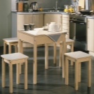 En règle générale, les tables carrées sont complétées par des éléments coulissants. Ils sont parfaits pour les petites cuisines, ils prennent un peu de place et, si nécessaire, se décomposent rapidement.En choisissant un modèle de cuisine de forme ronde, vous devez vous préoccuper de la disponibilité d'espace dans la cuisine. Ce type de mobilier ne peut être placé qu'au milieu de la pièce ou dans un coin s'il y a une fenêtre à côté. Le diamètre minimum du plateau de table ne dépasse pas 90 cm.