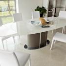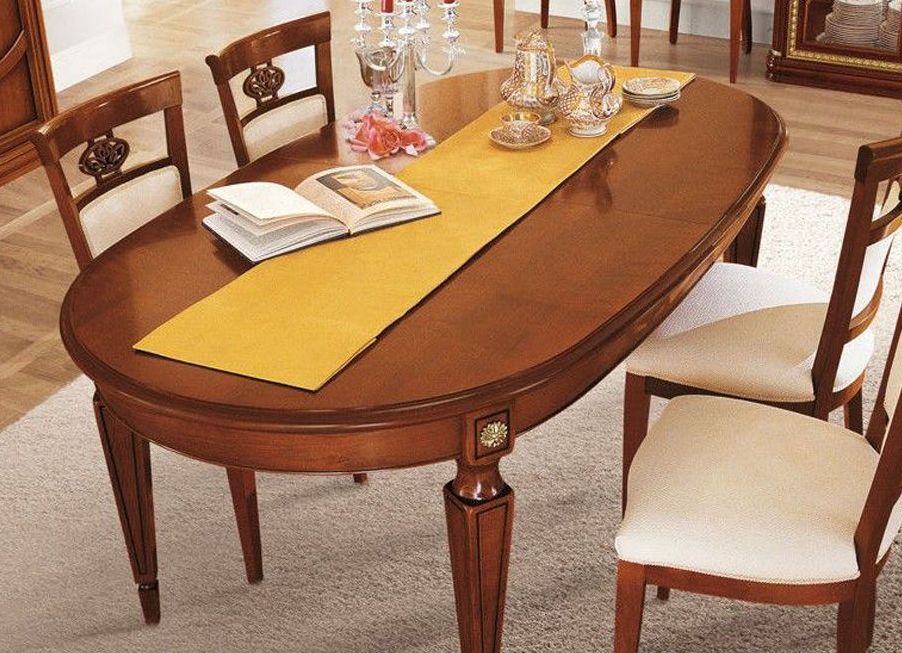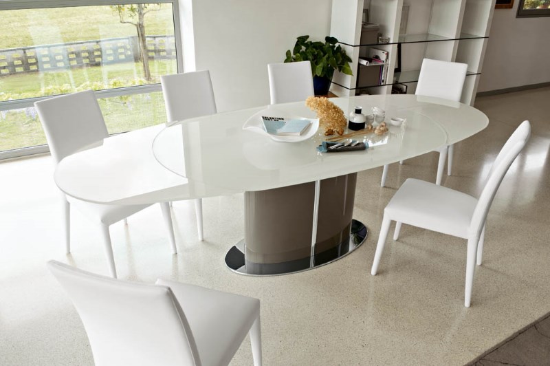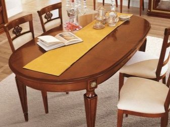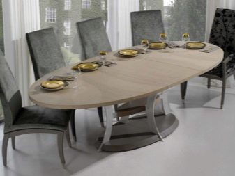 Les tables ovales ont l'air inhabituelles dans la cuisine. Ils sont pratiques et fonctionnent en toute sécurité, car ils manquent de virages serrés. De plus, la forme ovale vous permet de décorer la cuisine à l’origine.