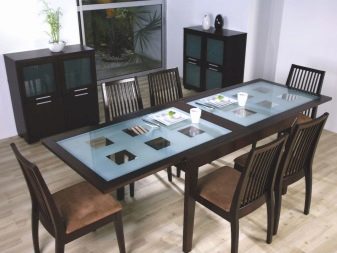 En choisissant de grandes tables de cuisine dans un style moderne, vous pouvez facilement faire un paradis de la cuisine. Ils se caractérisent par un plateau en verre, décoré d'éléments divers, ainsi que par des pieds en bois massifs. Ces options sont considérées comme les plus modernes et élégantes. De plus, la combinaison originale de bois et de verre contribue à compléter l'intérieur de la cuisine avec un look inhabituel.