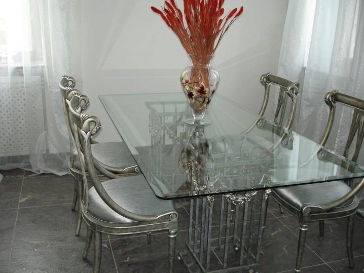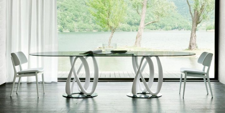Si vous optez pour un meuble avec un plateau en verre, vous devez faire attention à la qualité du traitement des bords et à l'épaisseur du verre. Le verre souillé sous influences mécaniques se casse rapidement et ne résiste pas à des charges énormes.Pour que ce type de table soit stable, il est conseillé d’acquérir des modèles dans lesquels il existe des pieds avec vis de réglage.
