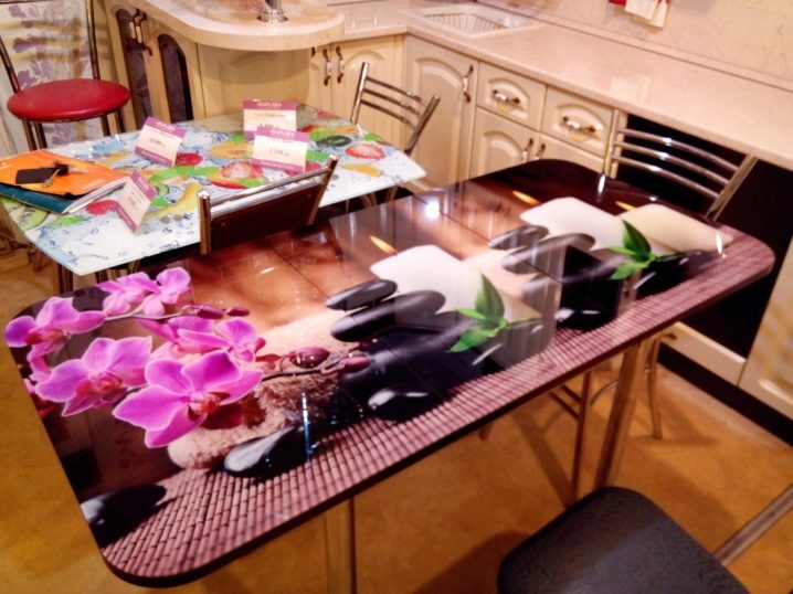 La combinaison inhabituelle de matériaux permet aux meubles d'avoir un aspect spectaculaire et coûteux, et les dessins sous le verre deviennent visuellement volumineux. La seule chose qui nécessitera une attention particulière dans ces modèles de tables, car le liquide renversé peut se glisser sous le verre et l’enlever sera difficile.