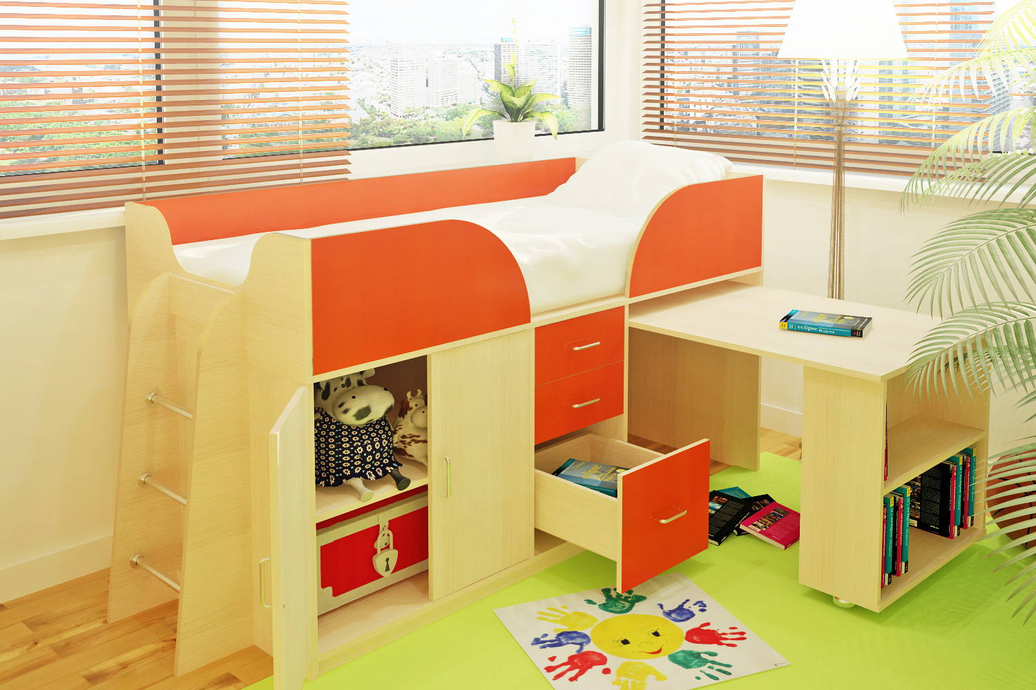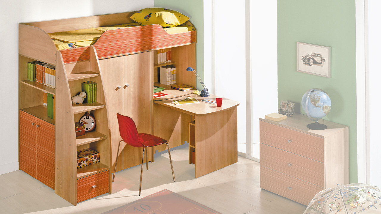 Un bureau pour la maison, combiné à un lit, est considéré comme le meilleur choix de mobilier pour une pièce de petite taille. C'est une structure complexe à deux étages.Au rez-de-chaussée se trouve la table avec tiroirs et étagères, et le lit au deuxième étage. Un tel modèle peut élargir l'aire de jeu de la chambre des enfants.
