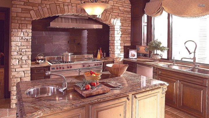Vous trouverez dans les magasins de la ville des pierres artificielles et des carreaux décoratifs. La décoration en pierre convient mieux dans une grande salle de cuisine. Par exemple, dans un studio, où des pierres décoratives ou des carreaux seront également placés sur les murs.