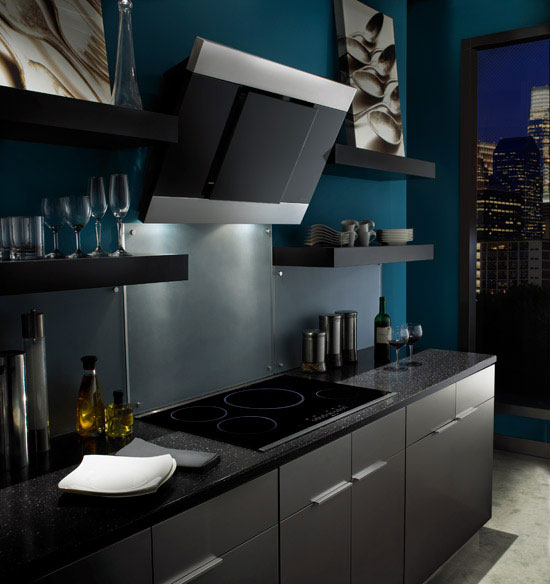 Modèles en forme de T bien adapté à la conception de la cuisine dans le style du minimalisme avec une prédominance de meubles et des lignes géométriques claires.Ces capots sont en aluminium et en verre - ces options ont l’air élégant et inhabituel.