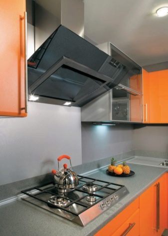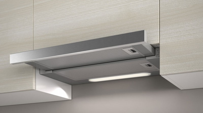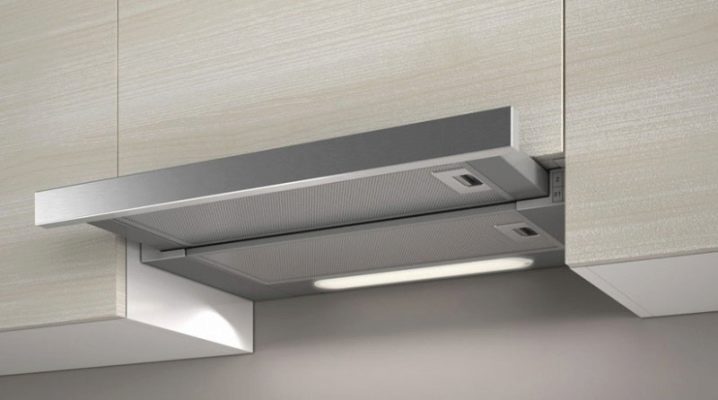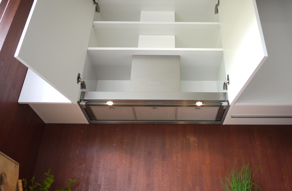 Dispositifs d'échappement intégrés - la solution optimale pour les petits espaces. En règle générale, ces modèles sont intégrés au plan de travail et à l’armoire de cuisine, sont extensibles librement et fonctionnent même à la fermeture. Mais dans ce cas, le problème est de faire correspondre la taille du meuble, l'emplacement de la hotte et le reste de la cuisine, afin de ne pas le répartir, mais de le masquer.