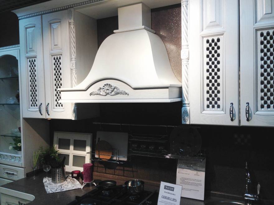 Si vous le souhaitez, vous pouvez maintenant trouver la hotte de toutes les couleurs pour tous les goûts et toutes les idées d'intérieur. Blanc, noir, marron, avec des motifs, des images de fleurs, décoré avec de la pierre artificielle, peinture, poursuite, et des insertions de morceaux de bois précieux sont offerts.