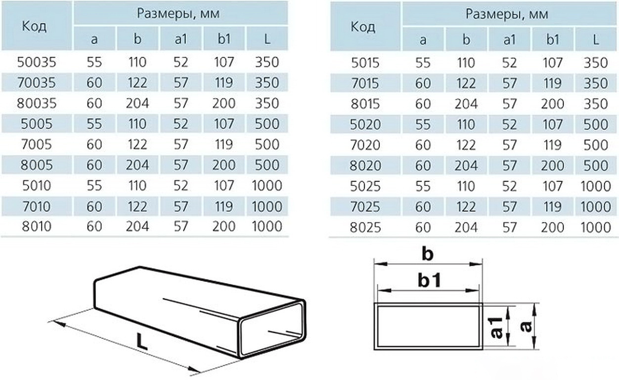 La variété des conduits rectangulaires comprend des produits plats. Ils attirent avec leur taille compacte, grâce à laquelle ils sont faciles à cacher. Il existe trois tailles standard: