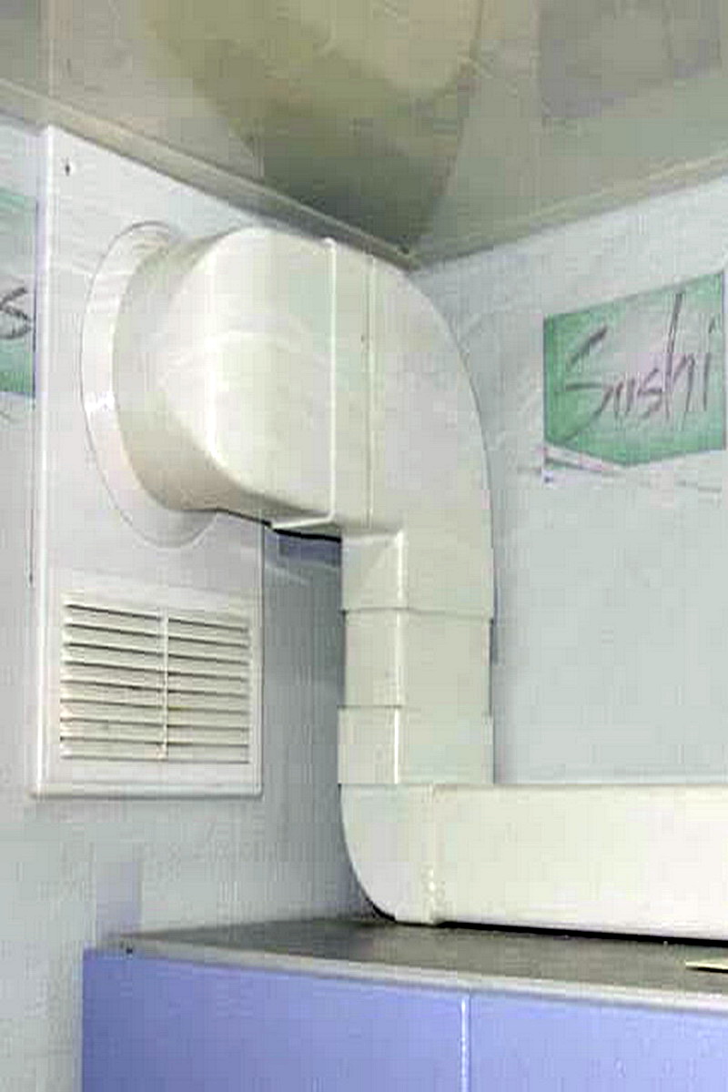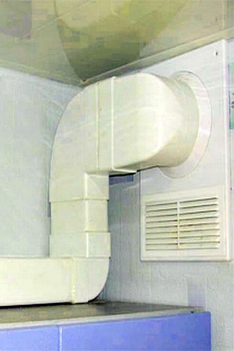 - Le nombre de tours du conduit doit être minimal, car chaque coude diminue l'efficacité de la hotte de cuisine de 10%. Les experts recommandent de ne pas installer plus de trois genoux.