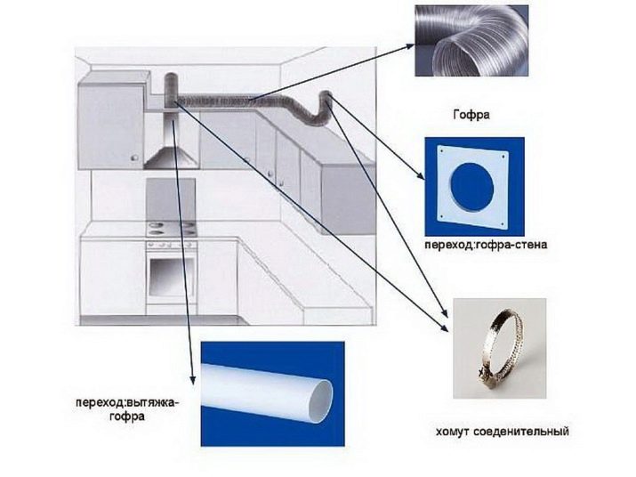 Il est préférable de choisir un conduit de diamètre identique ou supérieur aux paramètres de sortie de la hotte. Lorsque vous utilisez un tuyau de diamètre inférieur, les performances de ventilation se détériorent. Dans le même temps, le niveau de bruit augmentera et le moteur d’échappement fonctionnera dans un mode amélioré.Ces composants entraîneront une usure rapide du matériel.