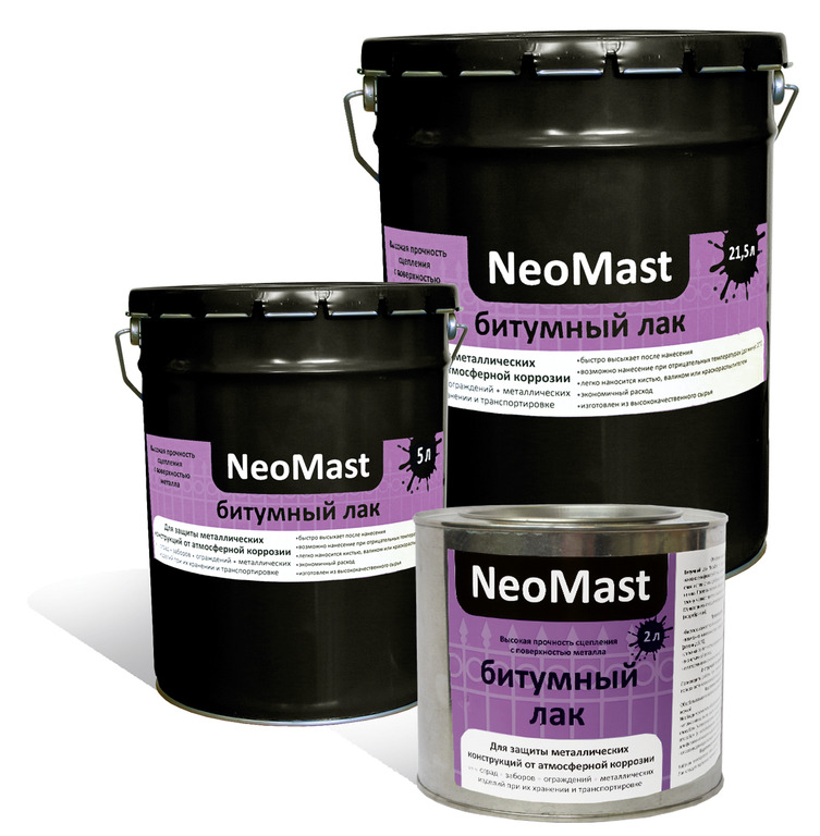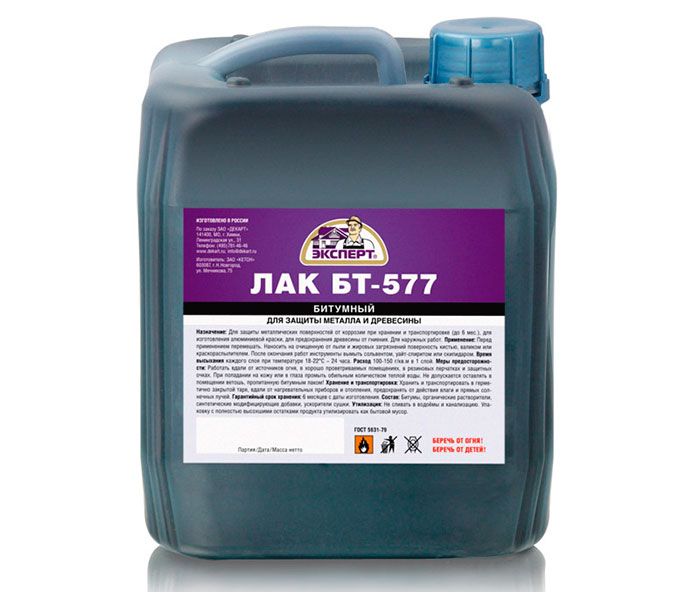 Le vernis est à base de bitume spécial, de résines polymères, de solvants organiques et d'additifs. Après application sur la surface, il forme un film noir solide. Il se caractérise par la résistance au gel, l'élasticité et l'élasticité, la résistance à l'influence des manifestations environnementales négatives et des températures élevées. Il convient de noter les propriétés environnementales et antiseptiques de la composition, ainsi que sa polyvalence. Ils peuvent traiter et protéger non seulement le métal, mais également les surfaces en pierre et en bois.