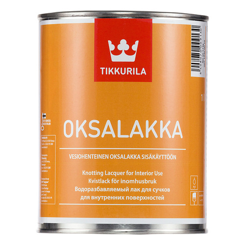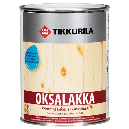 Vernis spécial pour le traitement des nœuds. Si vous êtes préoccupé par la possibilité que des tâches brunes de résine apparaissent à la surface des nœuds après avoir peint du bois, vous avez besoin de l'outil spécial Oksalakka!