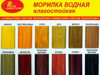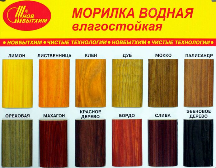 La teinture est représentée par une variété de nuances différentes, ce qui vous permet de donner rapidement et facilement une nuance nécessaire à un plancher en bois. La palette de couleurs est diverse. Il existe un large choix d'une palette de couleurs de taches d'eau.