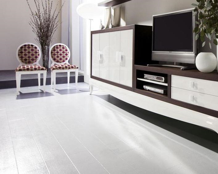 - Haut degré de réflexion de la lumière. Dans les pièces où le sol est blanc brillant, il est toujours beaucoup plus léger. Par conséquent, si les fenêtres de la pièce doivent être orientées vers le nord, il est préférable que le sol recouvre le stratifié brillant.