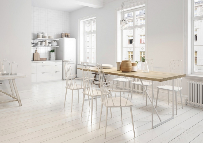 - Le sol blanc s'intègre parfaitement dans les intérieurs opposés - du minimalisme classique au minimalisme urbain.
