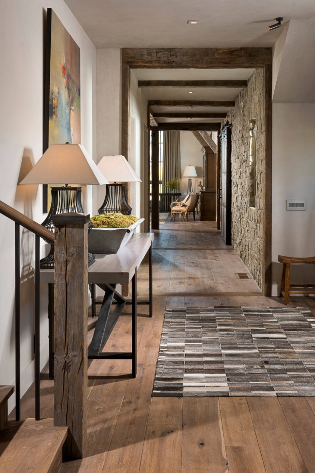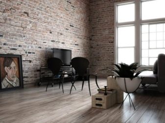 Le stratifié est combiné avec différentes surfaces et détails intérieurs - pierre, brique, plastique. Ici, vous pouvez voir sa combinaison intéressante avec la pierre, les meubles anciens, le bois et la création artistique moderne.