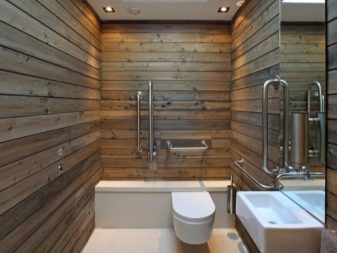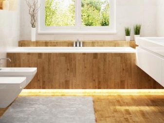 Le stratifié peut être utilisé non seulement comme revêtement de sol, mais également comme mur dans la salle de bain.Les bandes marron peuvent être gainées de bain, se concentrant ainsi sur son attention.