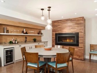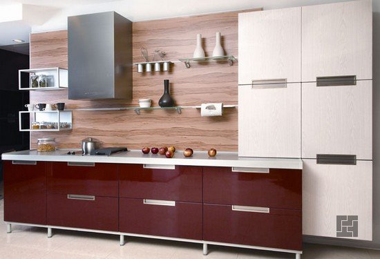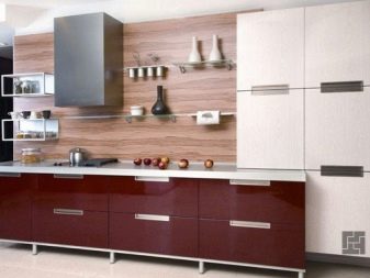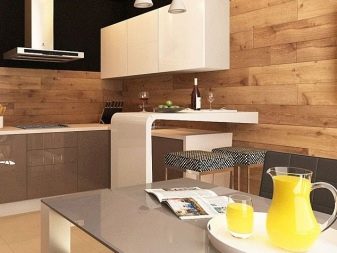 Le stratifié dans les cuisines est utilisé le plus souvent pour recouvrir le tablier de travail, il est recommandé de reproduire les ombres des façades de meubles. La décoration des murs à côté de la salle à manger ajoute à la fois originalité et apparence.