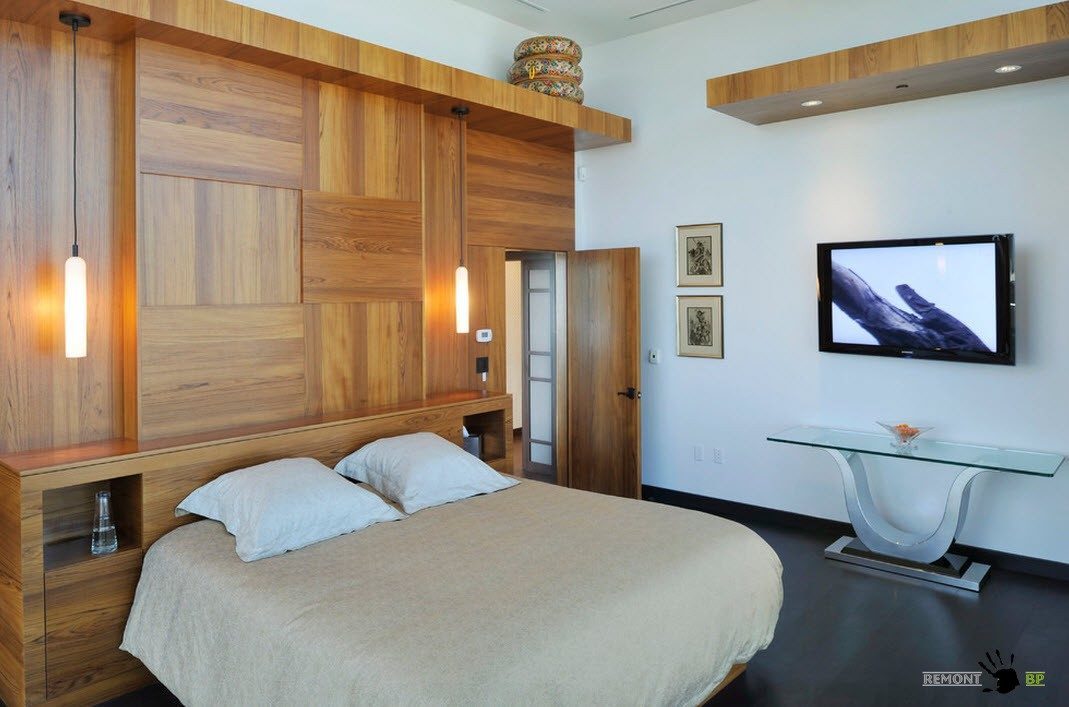 En créant une combinaison de différentes lamelles à la tête d'une couchette, vous pouvez «jouer» à la fois en couleur et en taille - vous obtenez un panneau intéressant.