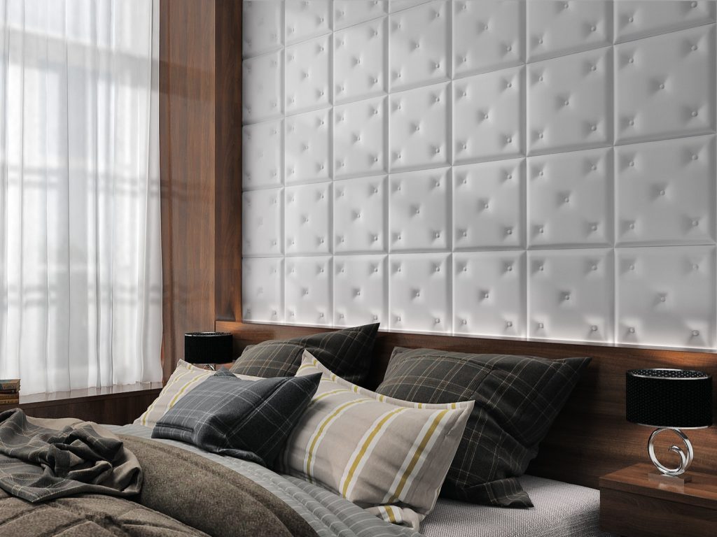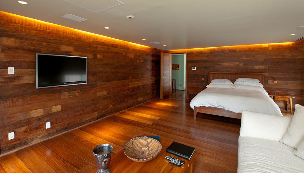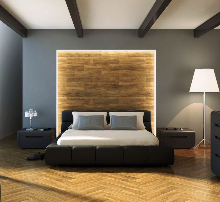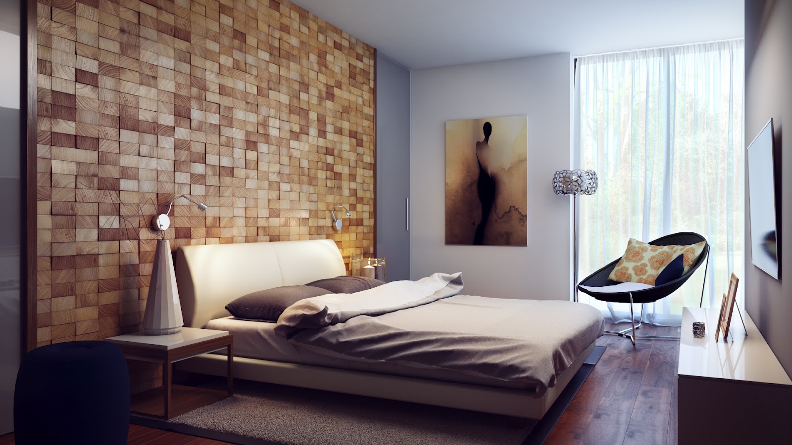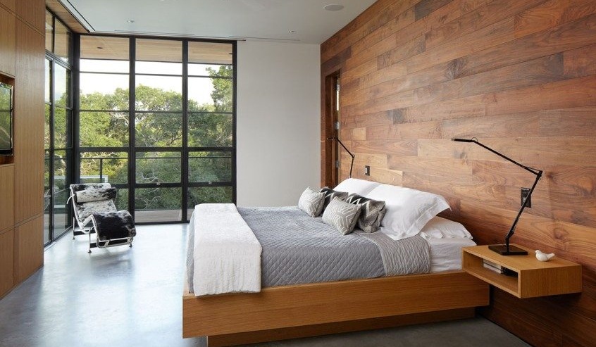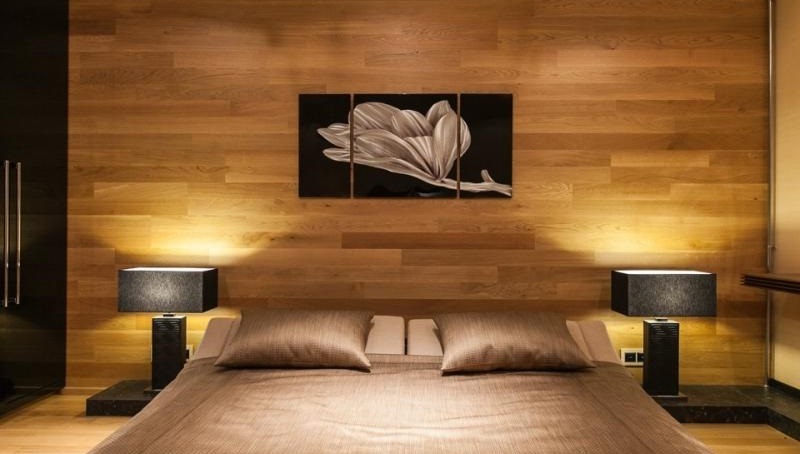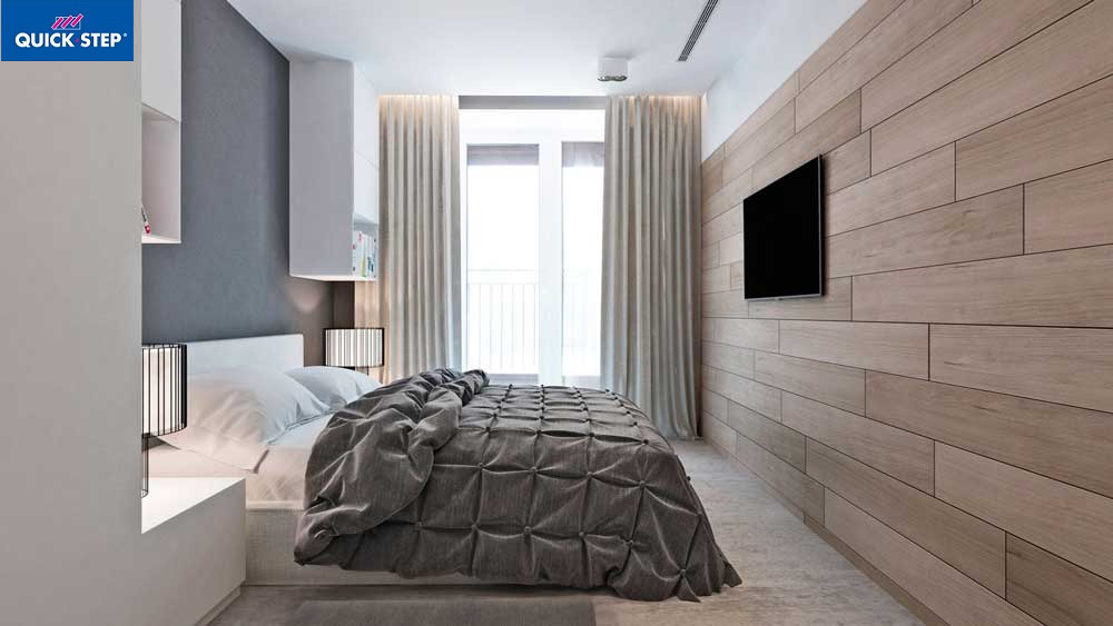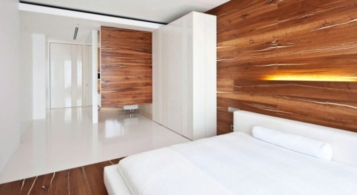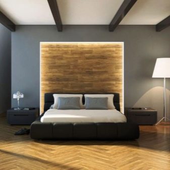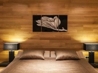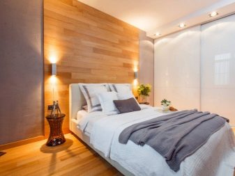 Vous pouvez installer des panneaux stratifiés comme revêtement mural dans presque toutes les pièces de l'appartement. Dans la chambre, allouez traditionnellement une partie du mur à la tête du lit. Le stratifié de bois chaud crée le confort et l’harmonie dans la pièce. Les murs stratifiés gainés dans la chambre peuvent être davantage isolés du bruit en utilisant une latte. En outre, il est facile de cacher les fils et les douilles des lampes.