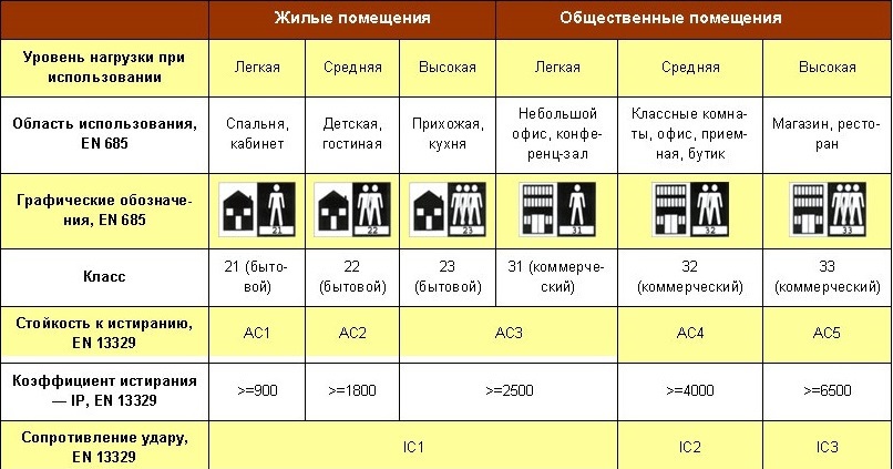 - 34 (AC6): la classe la plus durable et la plus résistante à l’usure, utilisée dans les gymnases, les aéroports, la durée de vie - jusqu’à 10 ans, n’est pratiquement pas utilisée dans les locaux domestiques en raison des prix extrêmement élevés.