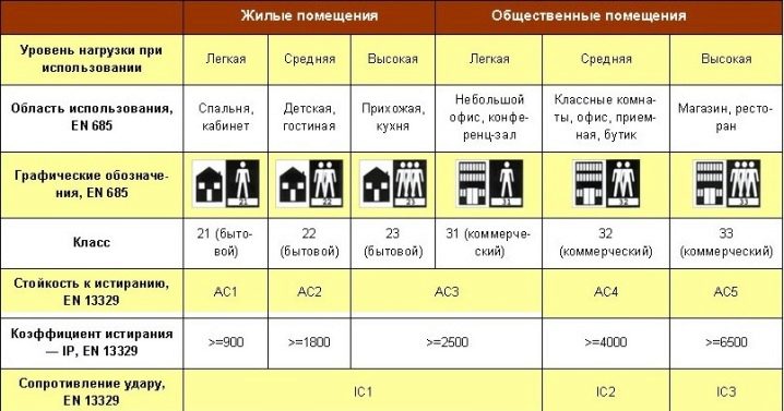 Pour la classification des stratifiés utilisant un étiquetage européen. Il est basé sur des tests de résistance à l'humidité, à l'abrasion, au degré de résistance et à l'absorption acoustique. À la suite de tous les tests, deux classes principales ont été identifiées: pour un usage commercial (31-34) et pour un usage domestique (21-23).