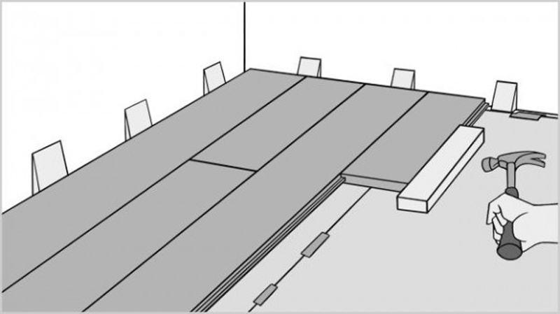 Les panneaux sont d'abord connectés en largeur, puis rejoignent les longues lignes. Les planches doivent être connectées sous un angle de 45 degréspuis abaissez doucement jusqu’à ce que vous entendiez un déclic. Pour la fente thermique au niveau de la jonction de la planche et du mur, des cales de dilatation en plastique sont placées et peuvent être retirées après la fin de la pose du revêtement de sol.
