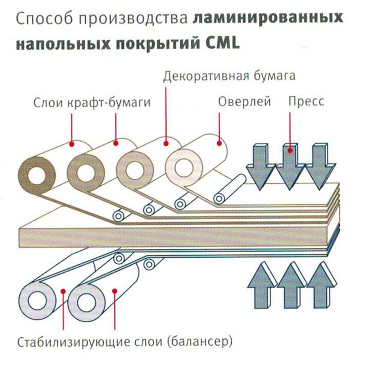 - La couche de compensation (équilibrante) est représentée par du papier kraft imprégné de résine de mélamine, offrant une excellente adhérence de toutes les couches du stratifié et augmentant de manière significative la résistance de la lamelle.