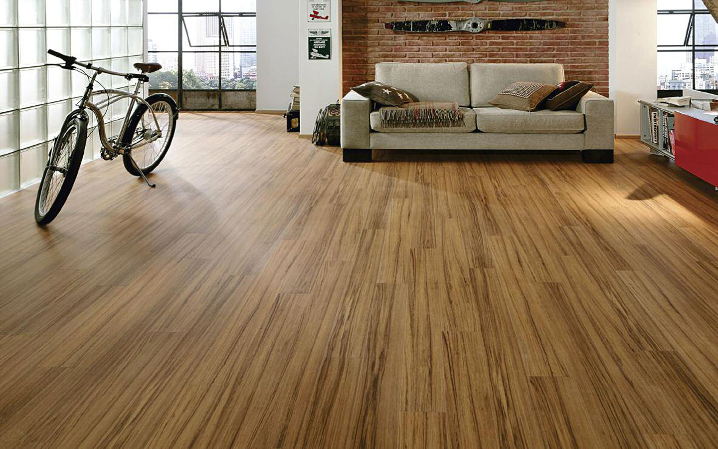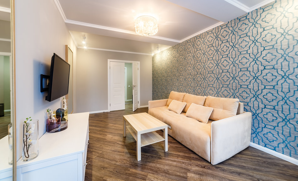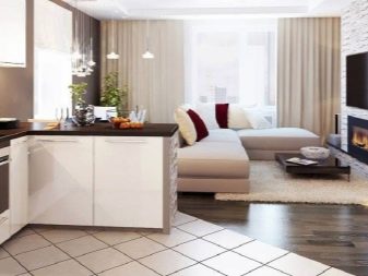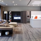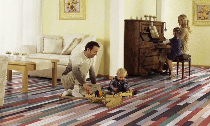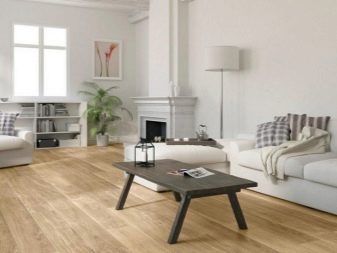 Dans différentes pièces, vous pouvez poser des stratifiés, fabriqués non seulement pour le bois ou la céramique, mais également pour les carreaux de pierre ou les briques. Important: n'apportez pas trop de tons sombres ou trop clairs dans la pièce, cela risquerait de créer un sentiment de lourdeur sombre ou de provoquer des associations avec une institution médicale. Plus la couleur du sol est claire, plus il sera facile à entretenir. - la poussière ne sera pas aussi visible que sur les surfaces sombres. Avec l'aide de larges bandes imitant les lames de plancher, vous pouvez agrandir la pièce. Le salon, aux couleurs neutres ou froides, sera transformé grâce à l’utilisation de sols stratifiés brillants et chauds.