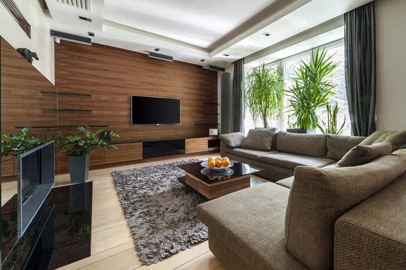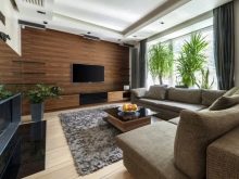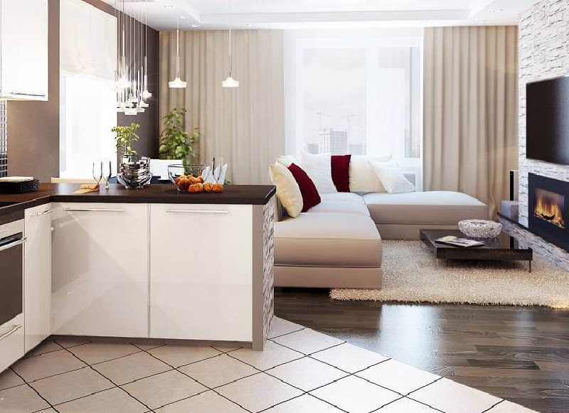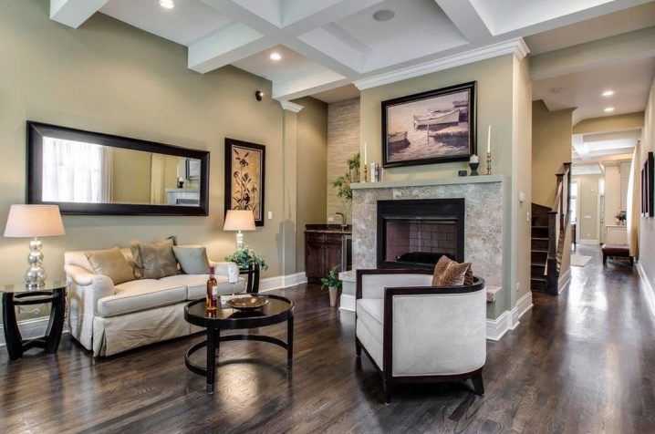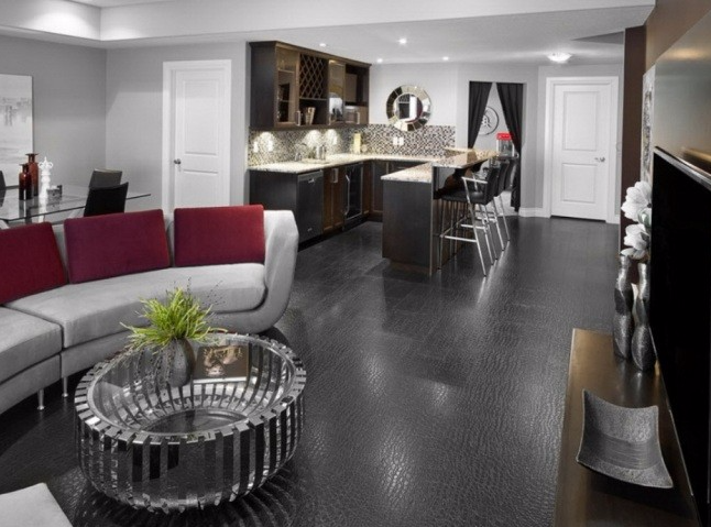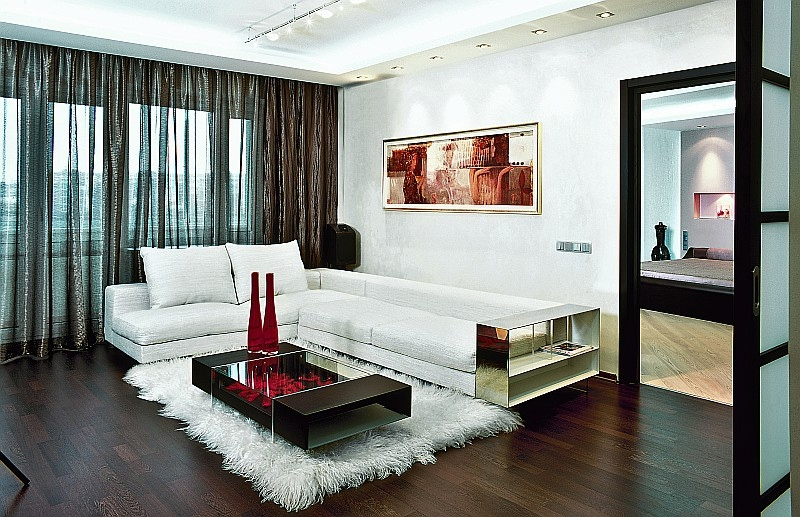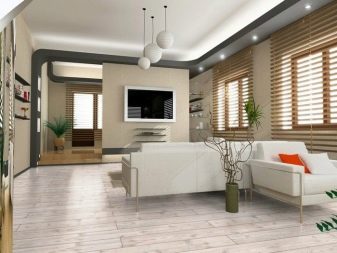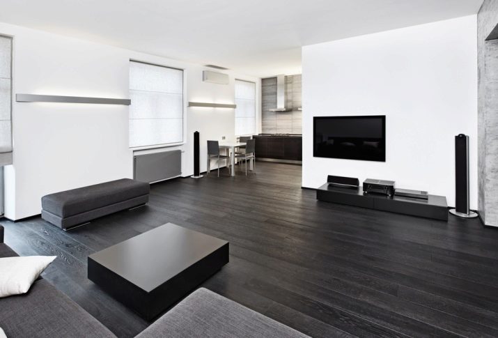 Le sol du salon, décoré de manière moderne, sera plus attrayant si vous utilisez les panneaux de deux couleurs opposées à la fois.